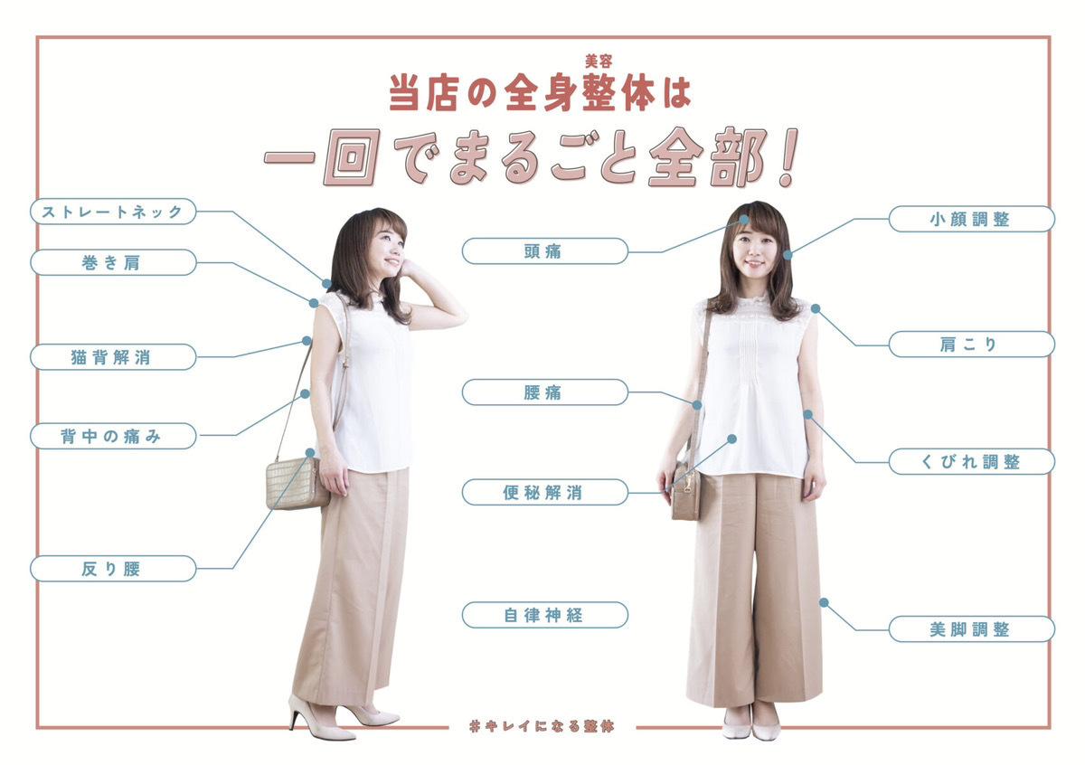 腰痛、肩こり、頭痛などの痛み改善はもちろんのこと、ストレートネック、反り腰、猫背、産後の骨盤矯正、小顔調整など、美しい姿勢改善もまるごと全部ご提供しています。痛みや疲れが取れて、ついでに見た目も良くなるって良いとは思いませんか?