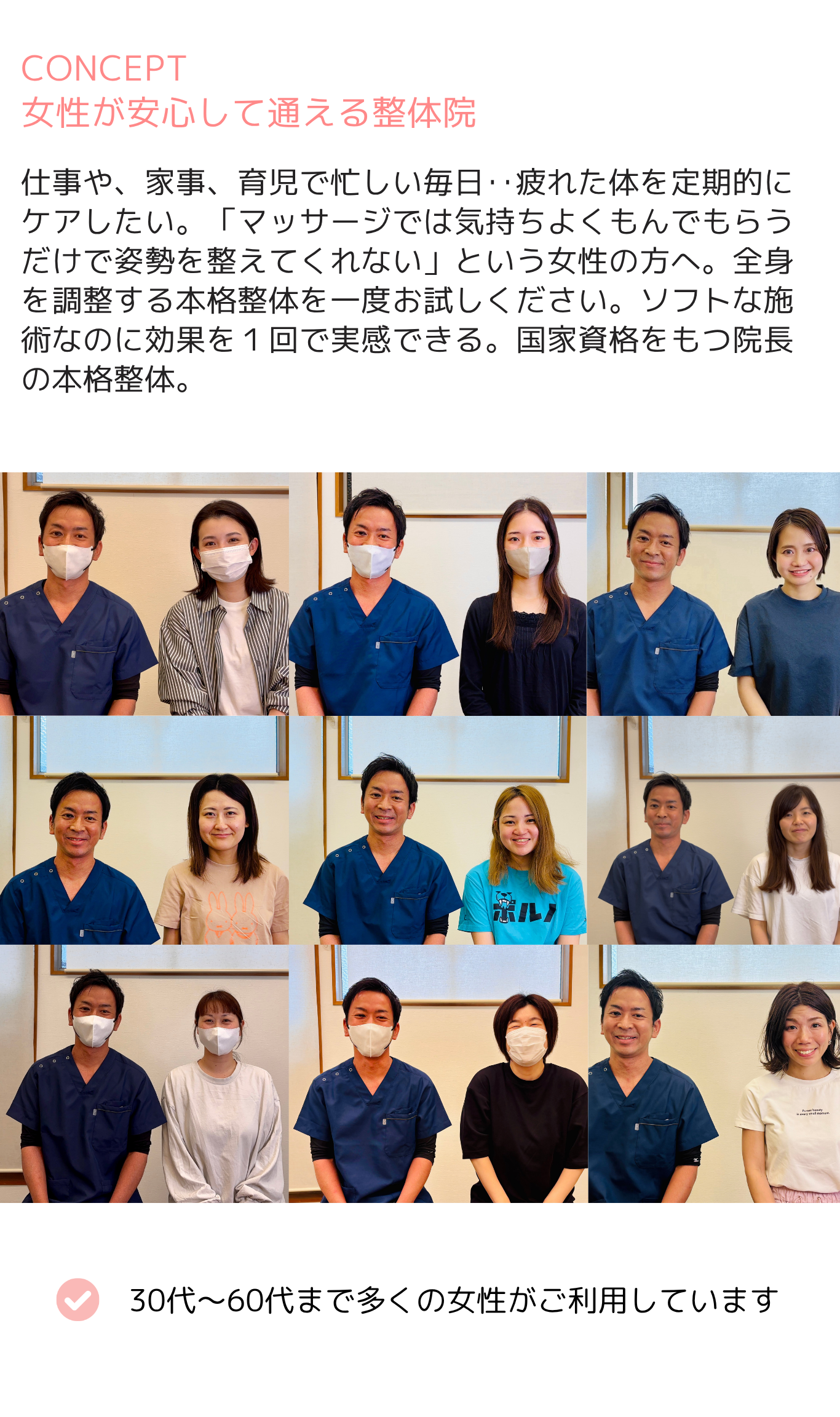 「女性が安心して通える整体」をご提供します。これまで2万人以上の方を施術した経験を活かし、
