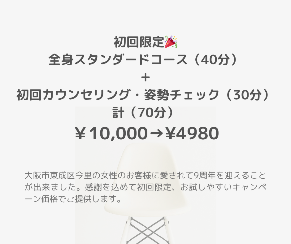 よくある整体院の回数券をやっていません。毎月通いやすい会員制を導入しています。一般の価格よりもお得に整体を受けていただけるので、ご来店の際にお問い合わせください。